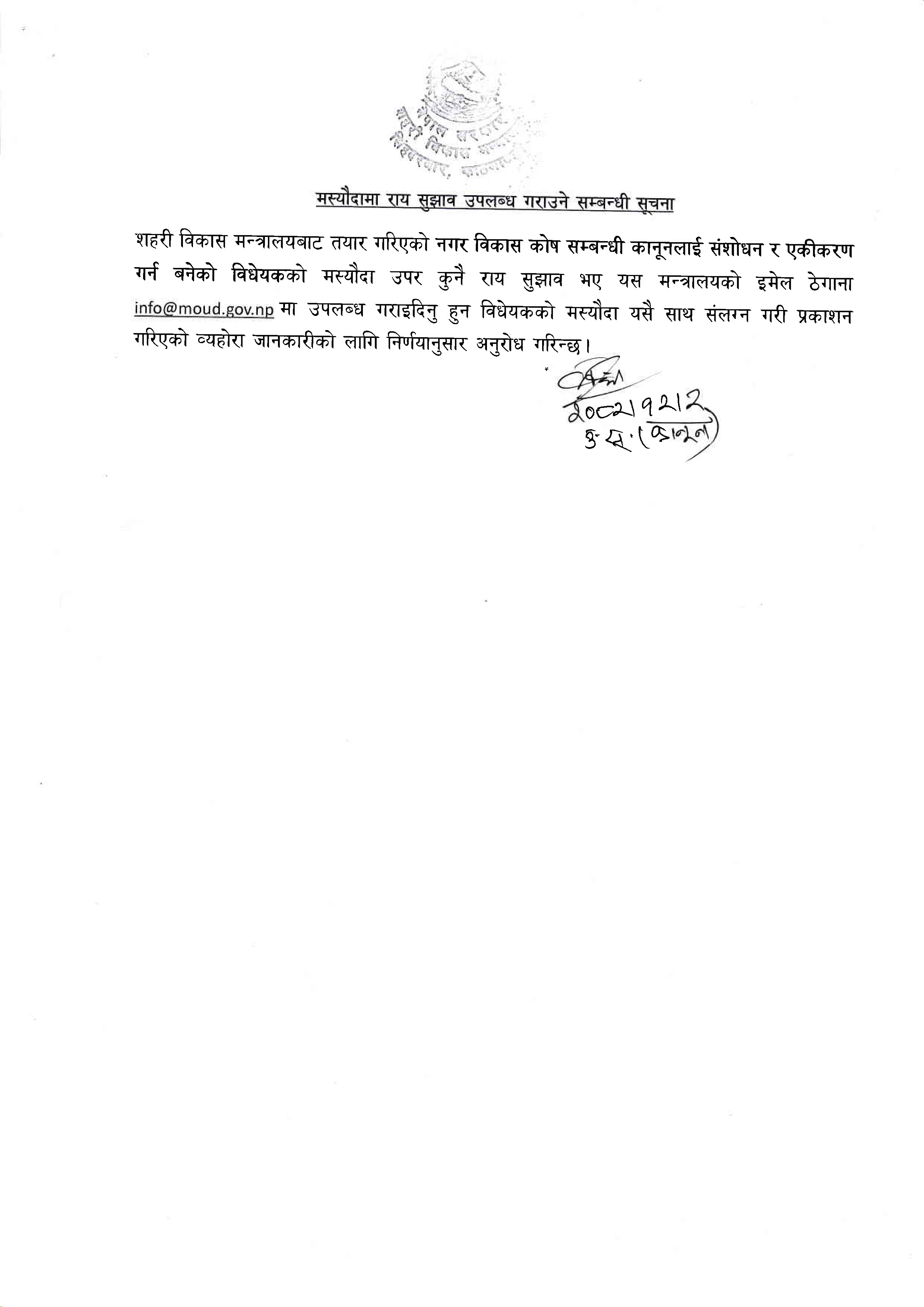 नगर विकास कोष सम्बन्धी कानूनलाई संशोधन र एकीकरण गर्न बनेको विधेयकको मस्यौदामा राय सुझाव उपलब्ध गराउने सम्बन्धी सूचना