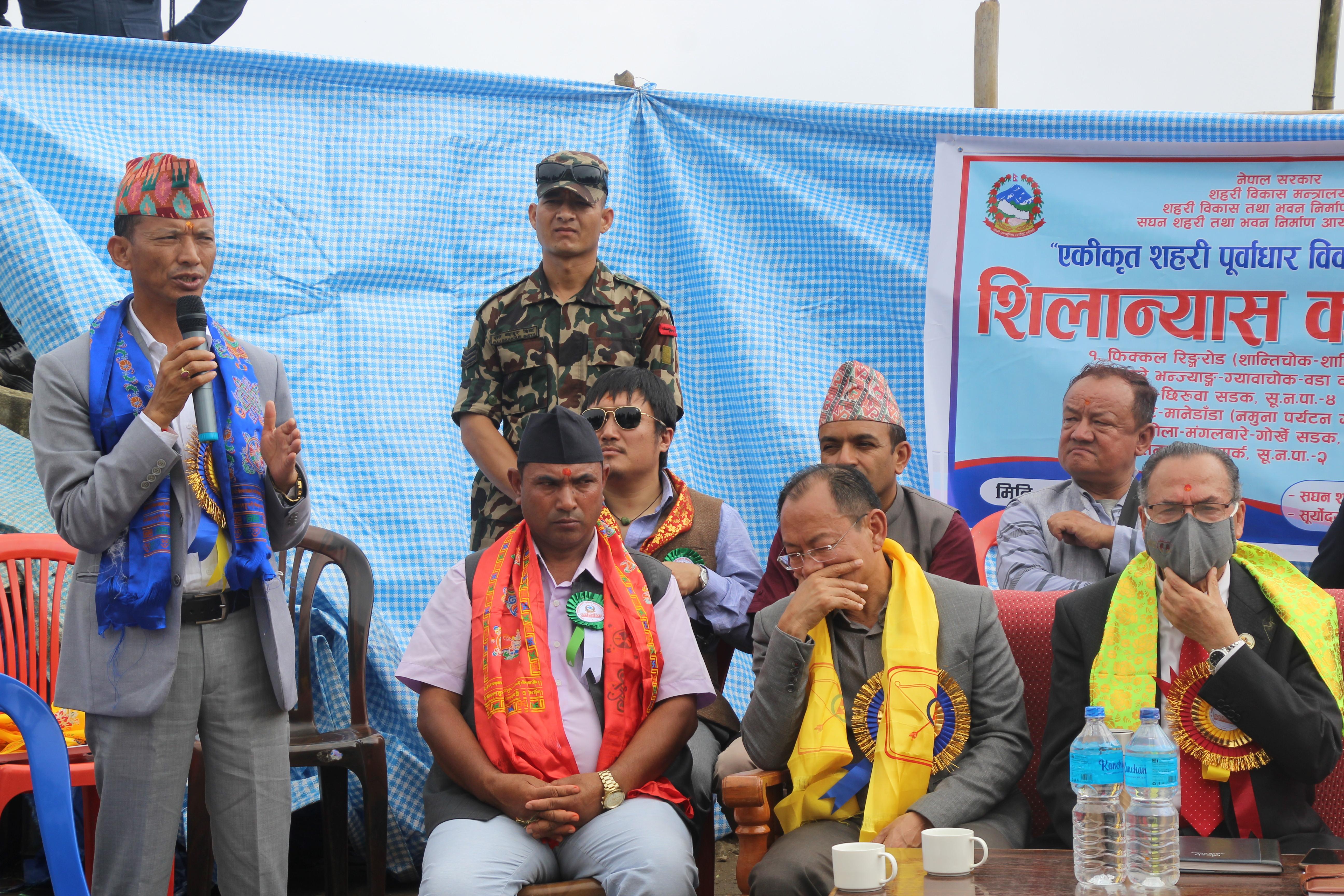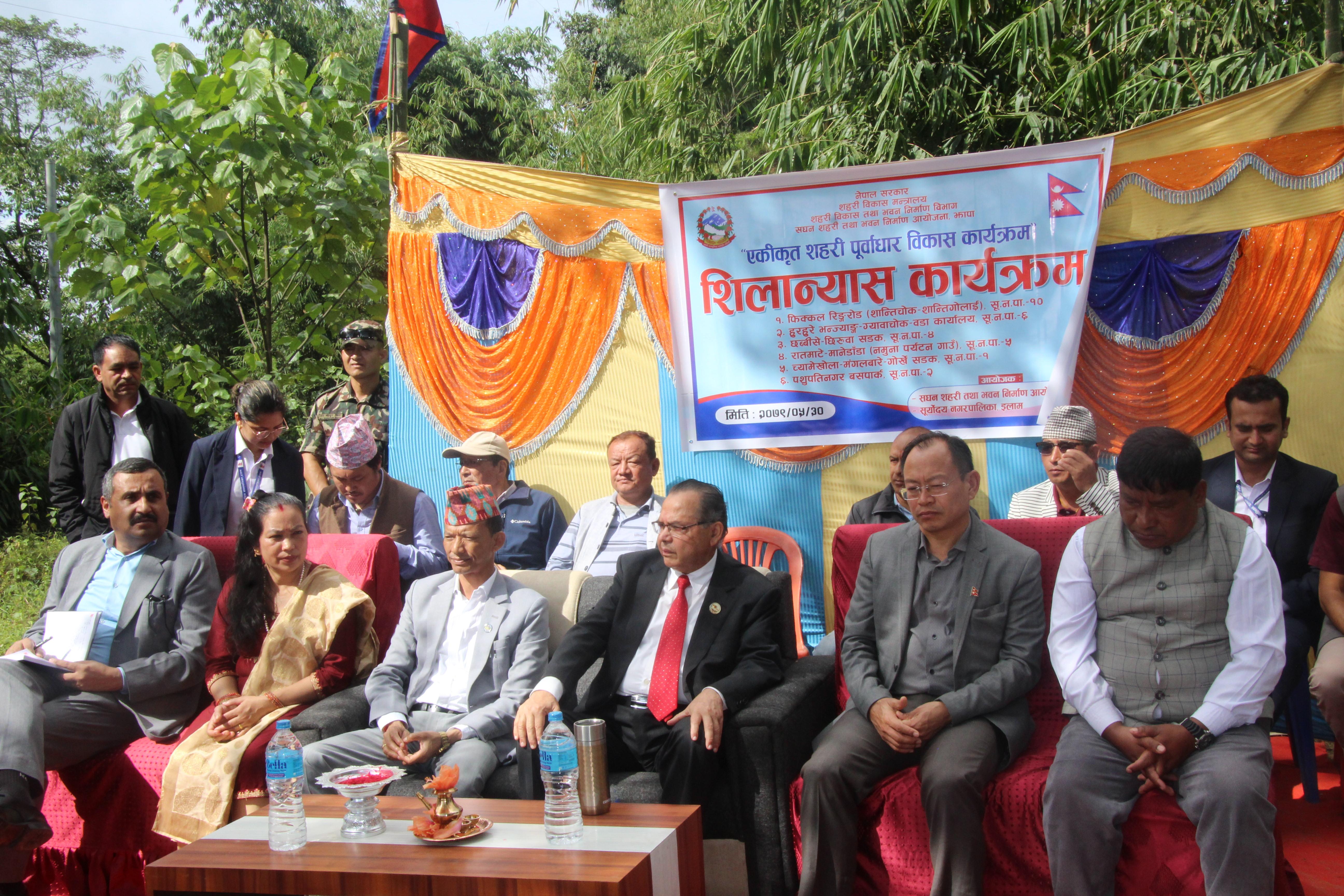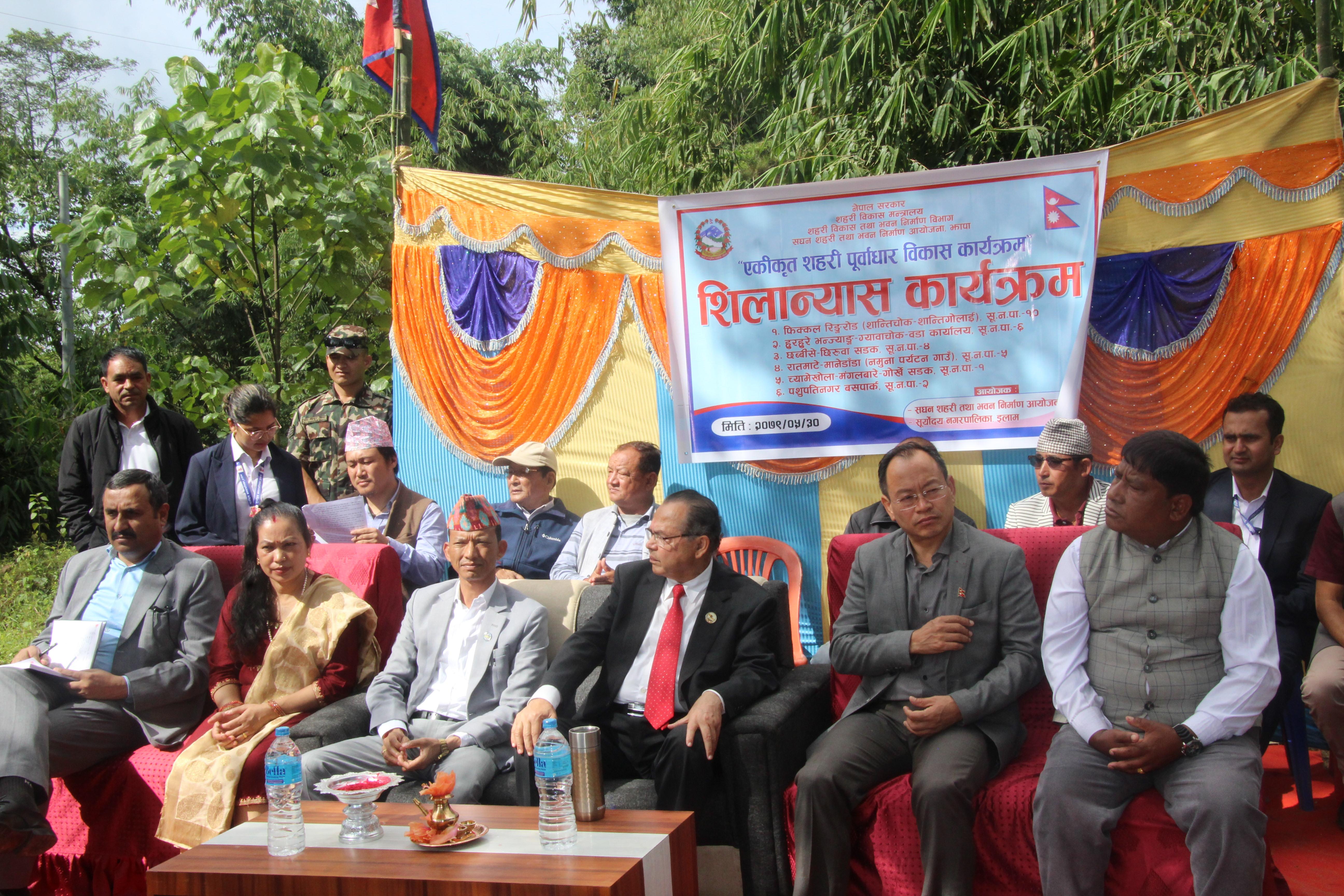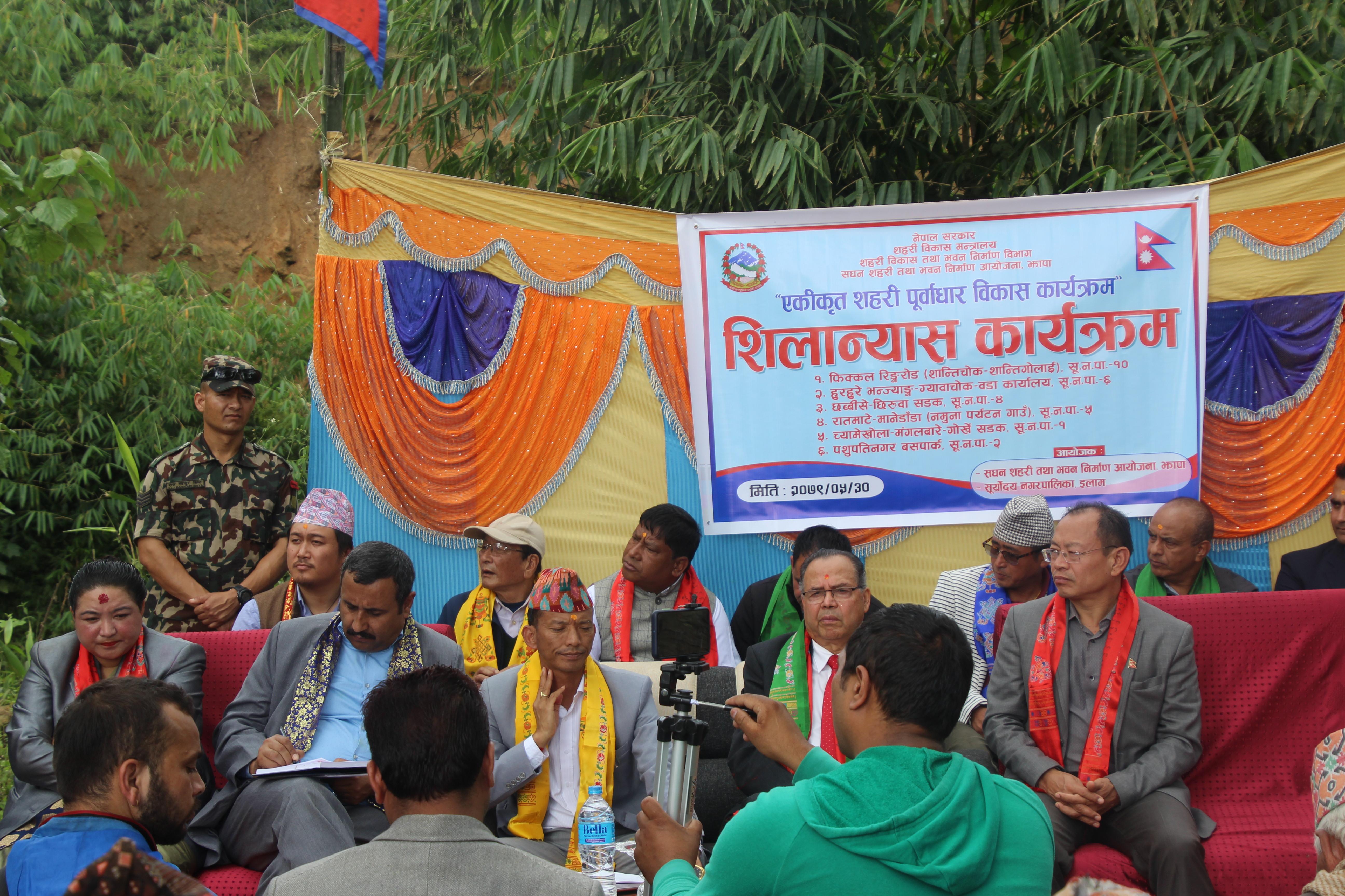 सूर्योदय नगरपालिका, इलामका विभिन्न स्थानमा एकीकृत शहरी पूर्वाधार विकास कार्यक्रमको शिलान्यास गर्नुहुँदै पूर्व प्रधानमन्त्री र माननीय शहरी विकास मन्त्री मेटमणि चौधरीज्यू