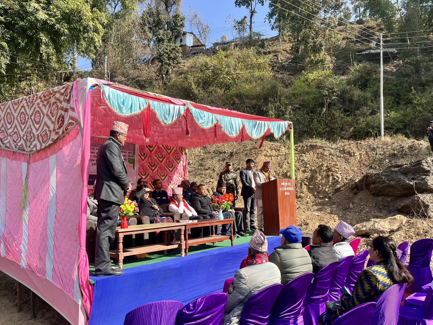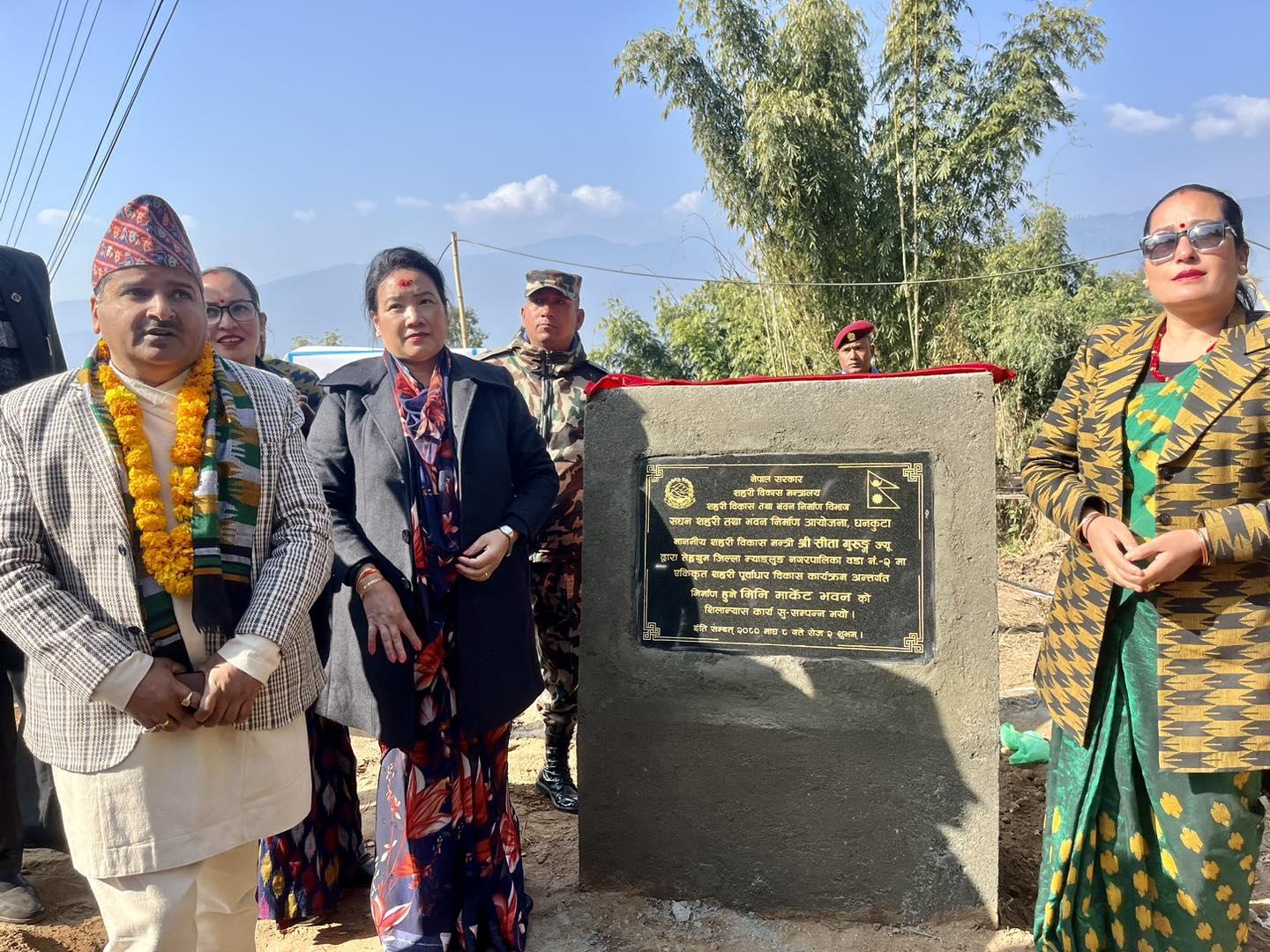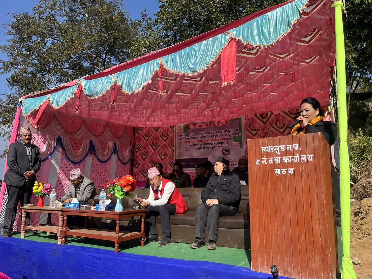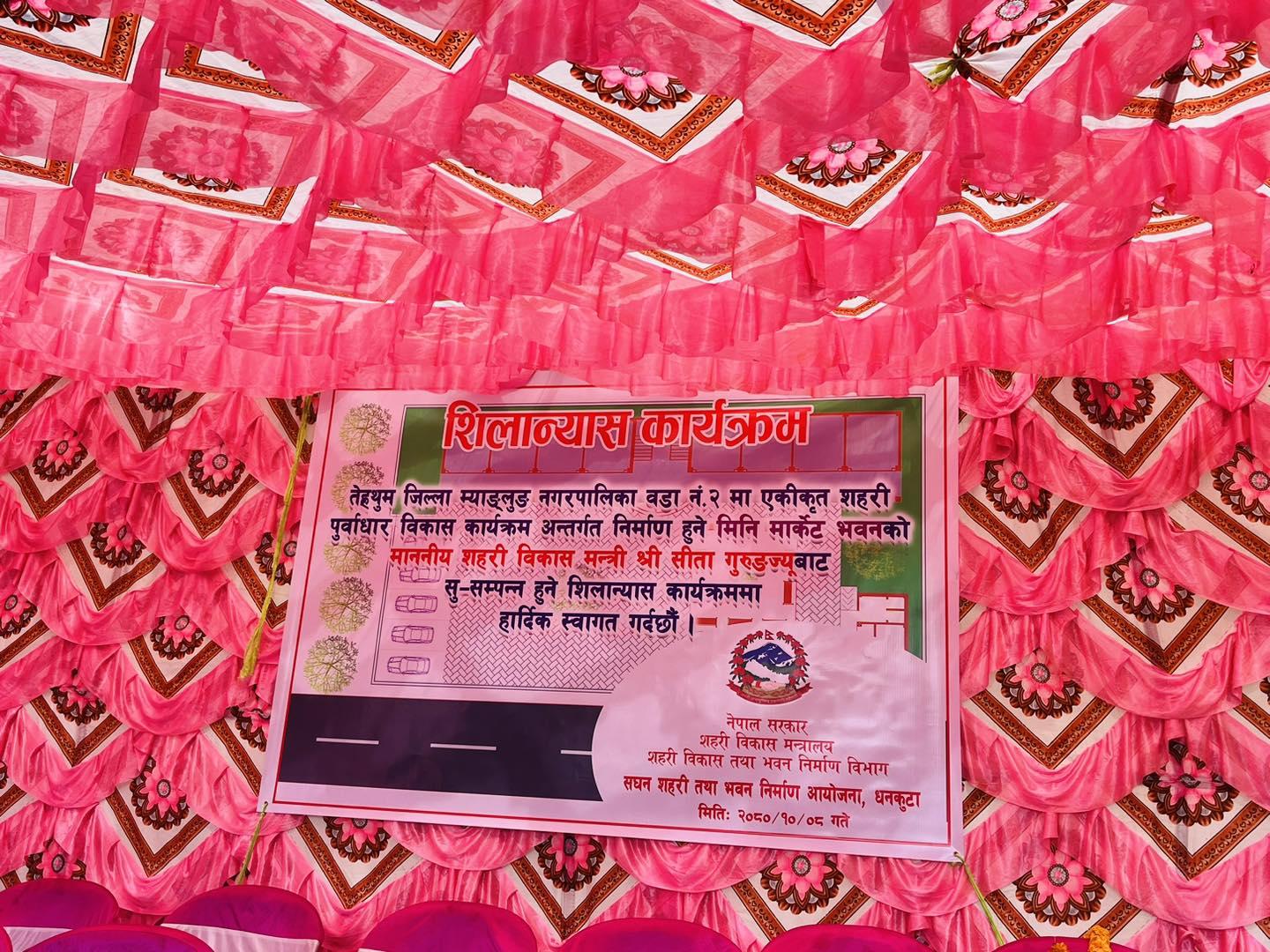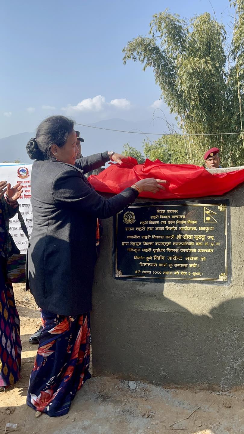 माननीय शहरी विकास मन्त्री सिता गुरुङज्यूबाट तेह्रथुमको म्याङ्लुङ न.पा., वडा नं. २ मा मिनी मार्केट भवनको शिलान्यास कार्यक्रम (२०८०-१०-०८)