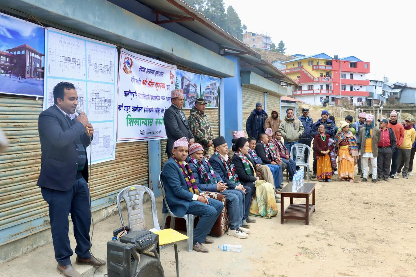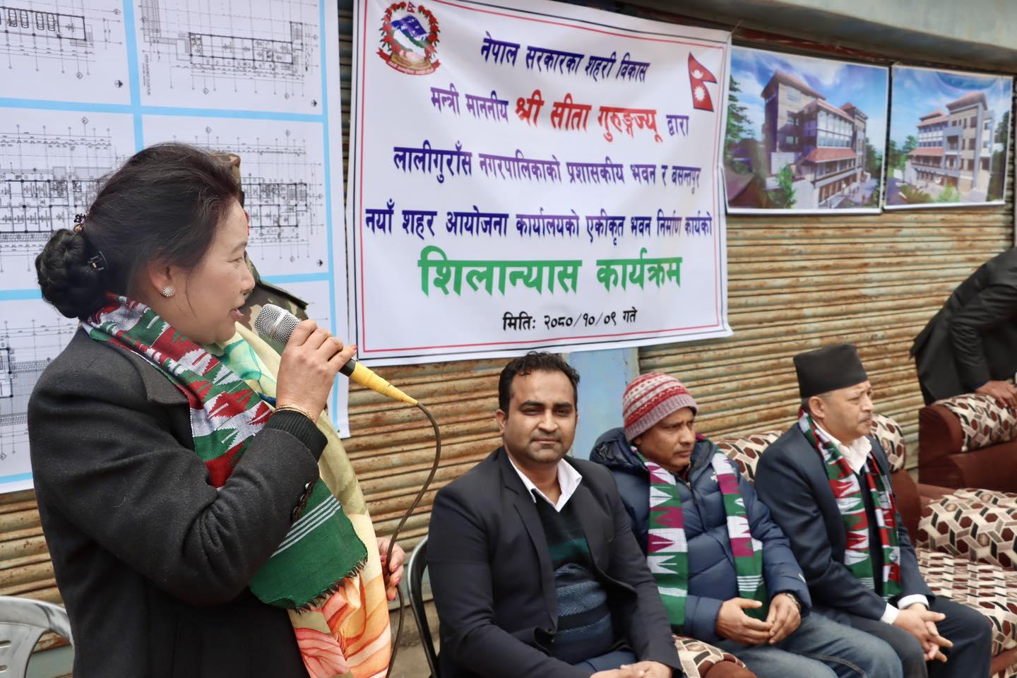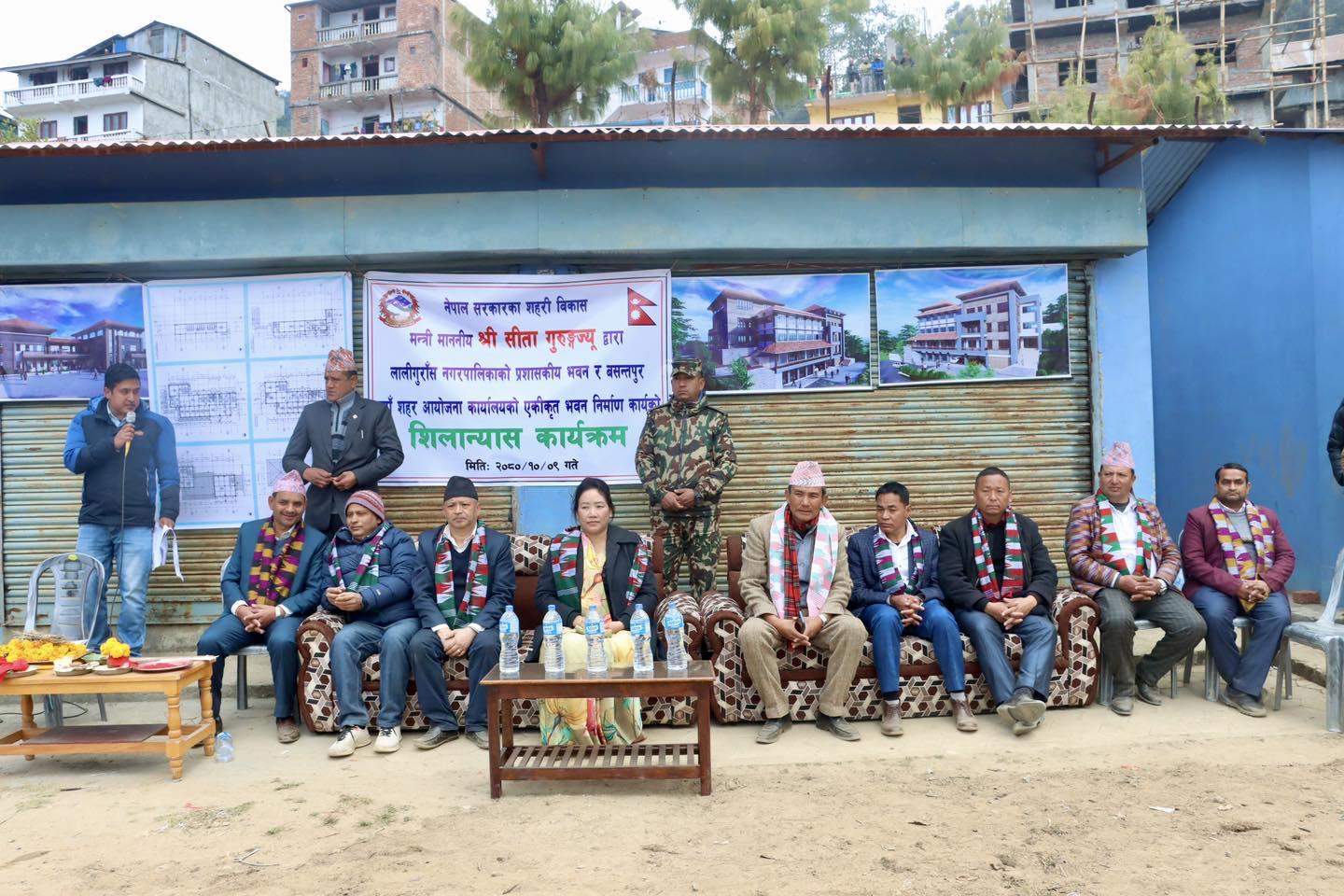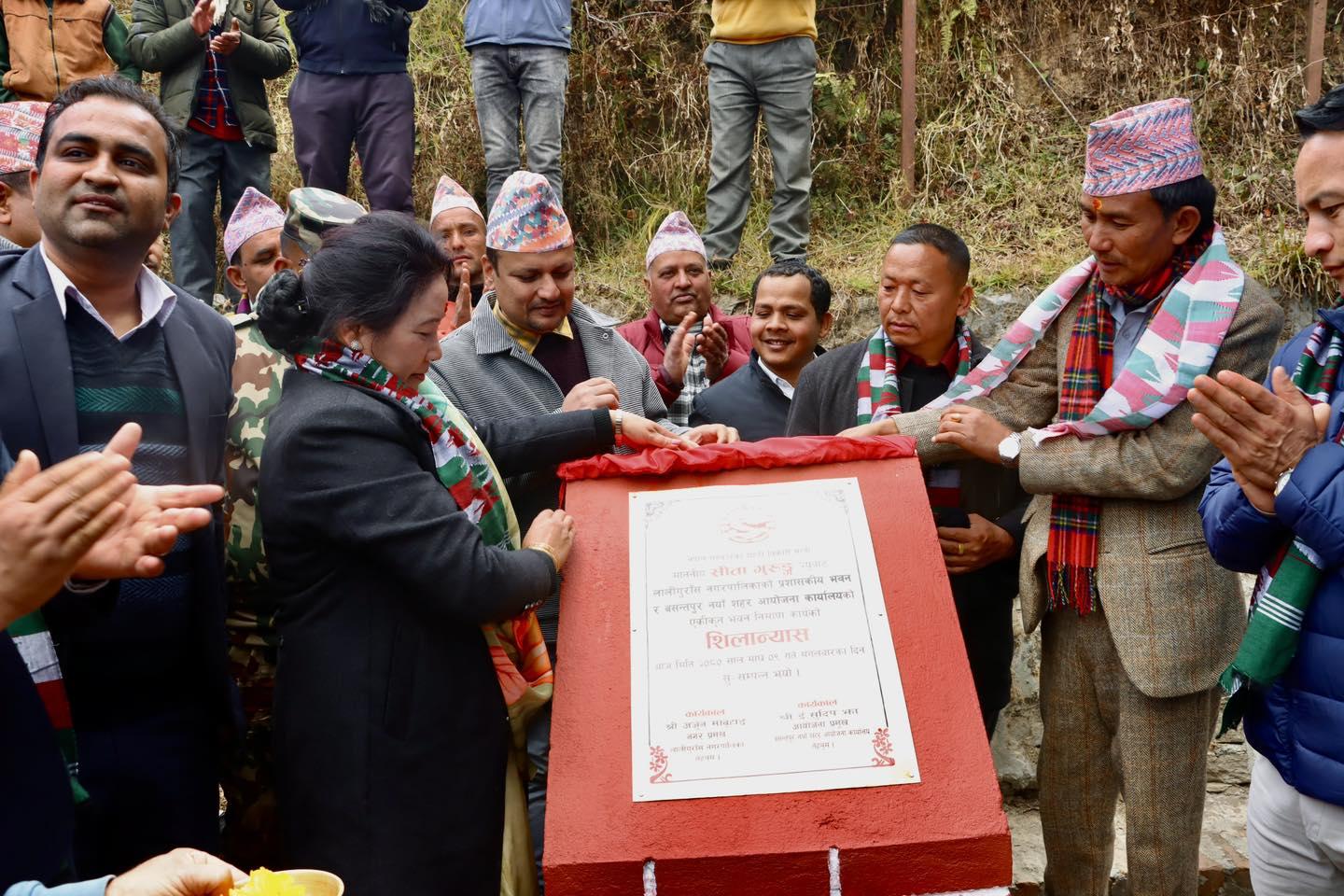 माननीय शहरी विकास मन्त्री सीता गुरुङज्यूबाट लालीगुराँस नगरपालिकाको प्रशासकीय भवन र वसन्तपुर नयाँ शहर आयोजना कार्यालयको एकीकृत भवन निर्माण कार्यको शिलान्यास कार्यक्रम (२०८०-१०-०९)